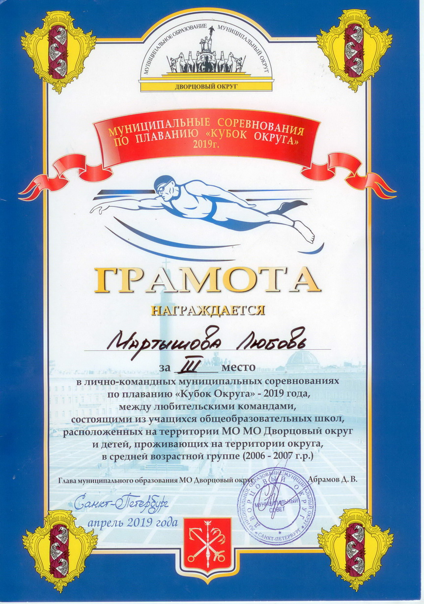 17 апреля 2019 года в спортивном ФОЦ «Локомотив» состоялись муниципальные соревнования по плаванию между любительскими командами, состоящими из учащихся общеобразовательных школ, расположенных на территории МО МО Дворцовый округ и детей, проживающих на территории округа, «Кубок Округа» - 2019 года. Соревнования проводились в личном и общекомандном зачете.