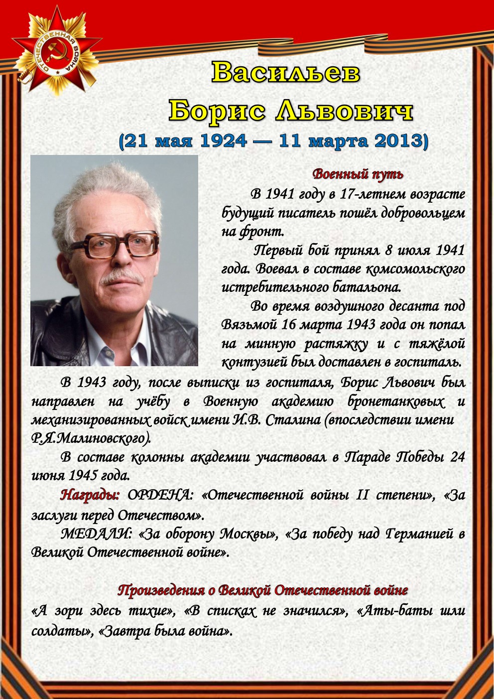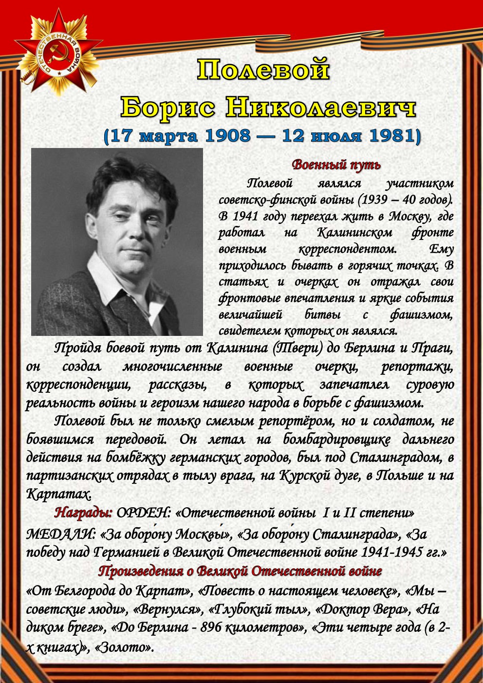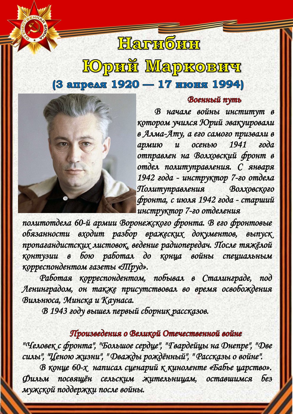 75 лет отделяют нас от начала Великой Отечественной войны (1941-1945). Но время не снижает интереса к этой теме, обращая внимание сегодняшнего поколения к далёким фронтовым годам, к истокам подвига и мужества советского солдата - героя, освободителя, гуманиста. Да, слово писателя на войне и о войне трудно переоценить.